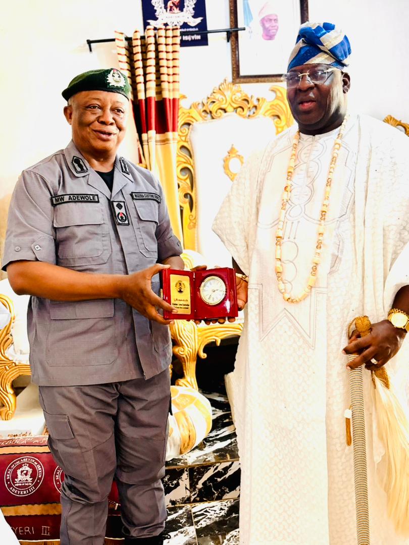 The Acting Customs Area Controller, Oyo/Osun Area Command of the Nigeria Customs Service, Deputy Comptroller Wale Adewole, on Thursday 12 March 2026, paid courtesy visits to the Aseyin of Iseyin Land, Oba (Dr.) Sefiu Olawale Oyebola Adeyeri III, and the Soun of Ogbomosho, Oba Ghandi Olaoye, as part of efforts to strengthen collaboration with traditional institutions in the fight against smuggling and the promotion of legitimate trade.